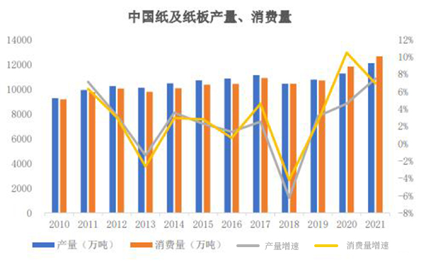 隨著我國(guó)經(jīng)濟(jì)總量的持續(xù)增長(zhǎng),我國(guó)紙及紙板的生產(chǎn)量和消費(fèi)量也穩(wěn)步增長(zhǎng)。我國(guó)紙及紙板生產(chǎn)量由2010年的9,270萬(wàn)噸增長(zhǎng)至2021年的12,105萬(wàn)噸,年均復(fù)合增長(zhǎng)率為2.46%,消費(fèi)量由2010年的9,173萬(wàn)噸增長(zhǎng)至12,648萬(wàn)噸,年均復(fù)合增長(zhǎng)率為2.96%。自2010年至今,除2013年和2018年以外,其他年度我國(guó)紙及紙板的生產(chǎn)量和消費(fèi)量均呈上升趨勢(shì)。特別是2020年和2021年,我國(guó)紙及紙板消費(fèi)量同比增速分別為10.49%和6.94%,增長(zhǎng)速度較快。2010-2021年,我國(guó)紙及紙板產(chǎn)量和消費(fèi)量變動(dòng)情況如下: